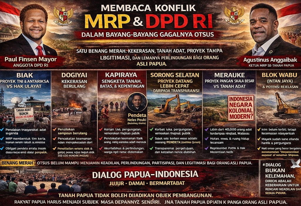 Yang justru tampak adalah ini: kekerasan berulang, tanah adat terancam proyek negara dan kepentingan ekonomi, masyarakat adat sering tidak dilibatkan secara bermakna, lembaga representasi belum cukup kuat, dan rakyat terus menjadi pihak yang paling menanggung beban. Polemik MRP dan DPD RI akhirnya hanya membuka permukaan dari luka yang jauh lebih dalam.